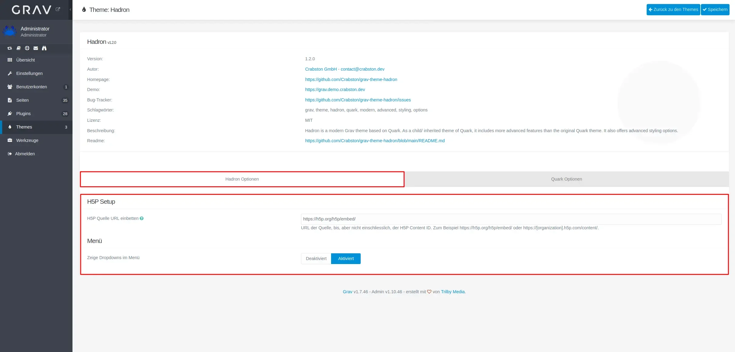 To configure the theme, navigate in the Admin Panel to Themes and select the Hadron theme.